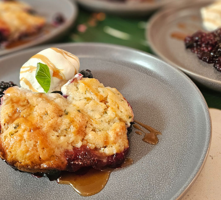 Fresh Basil and Local Honey Biscuit Topping, Vanilla Ice Cream, Bourbon Caramel Sauce